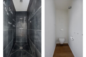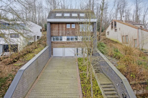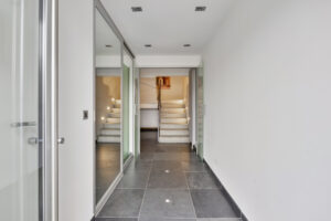- Op straatniveau bevindt zich een ruime inkom met leisteen vloer en praktische ruime vestiaire, twee inpandige parkeerplaatsen en een kelderruimte. Aansluitingen voor wasmachine en droogkast.