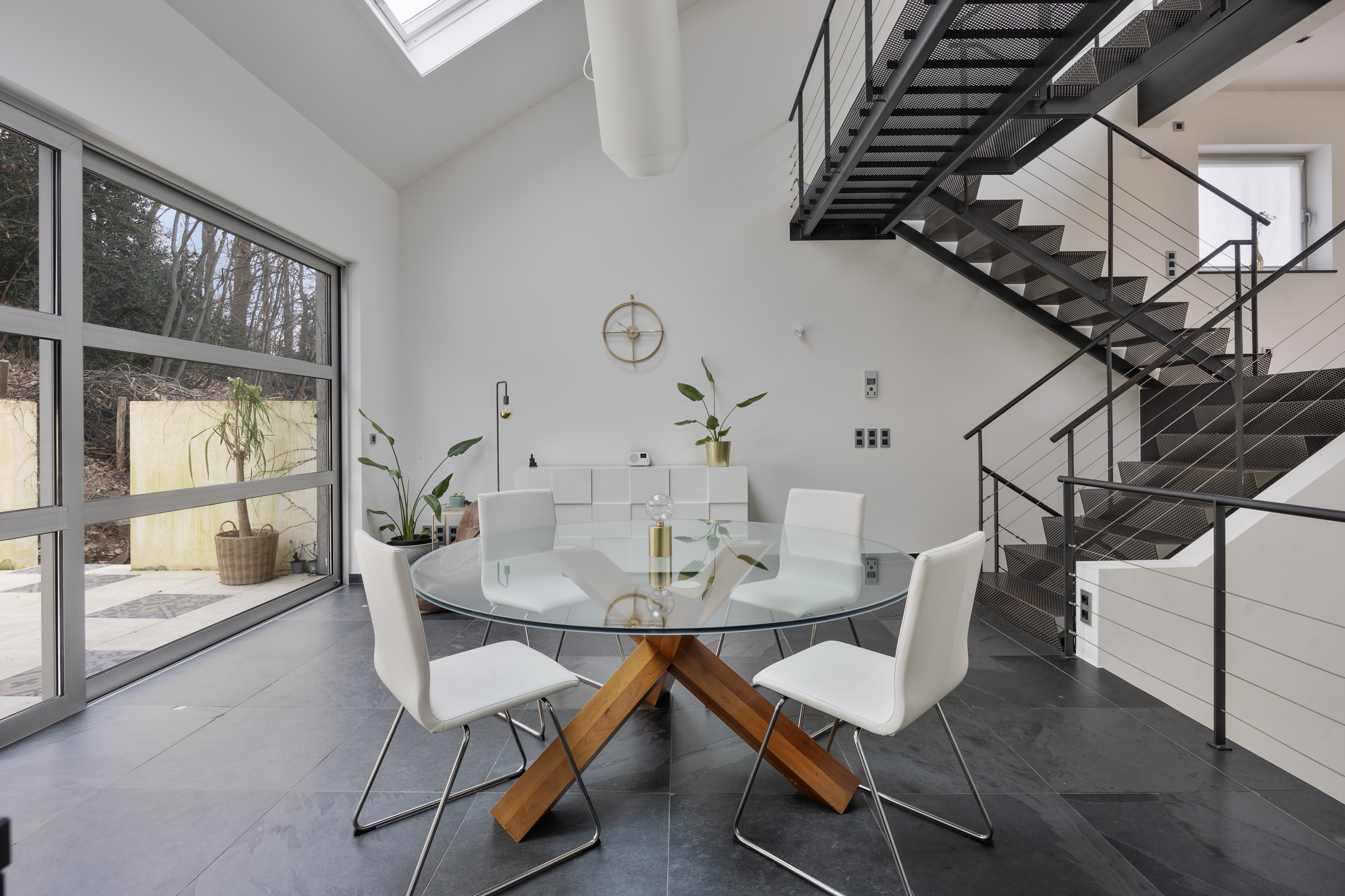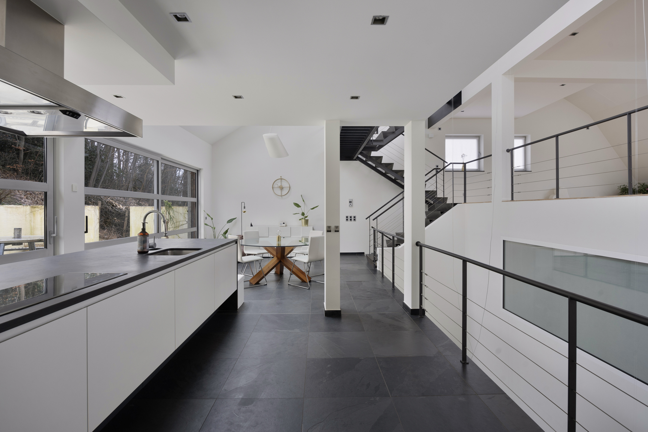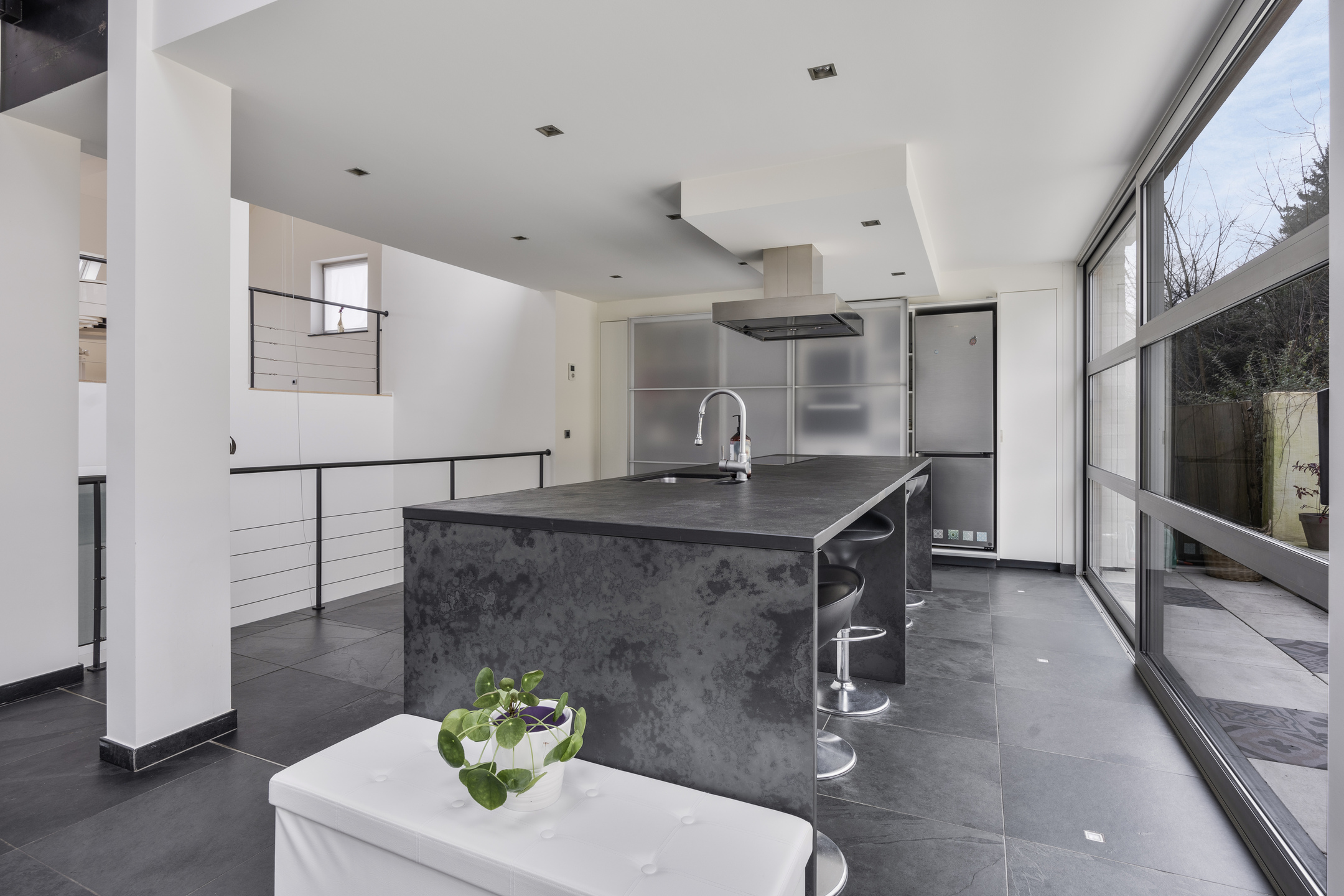 - Niveau +2,5: leefkeuken op tuinniveau. Groot keukeneiland met alle comfort. Overal leisteen (eiland en vloeren). Grote schuifdeuren naar het zuid-gerichte terras. Uitzicht op groen. Geen inkijk.