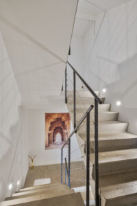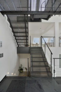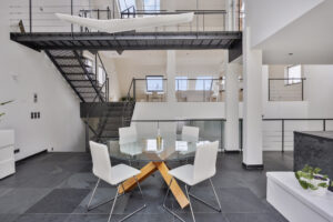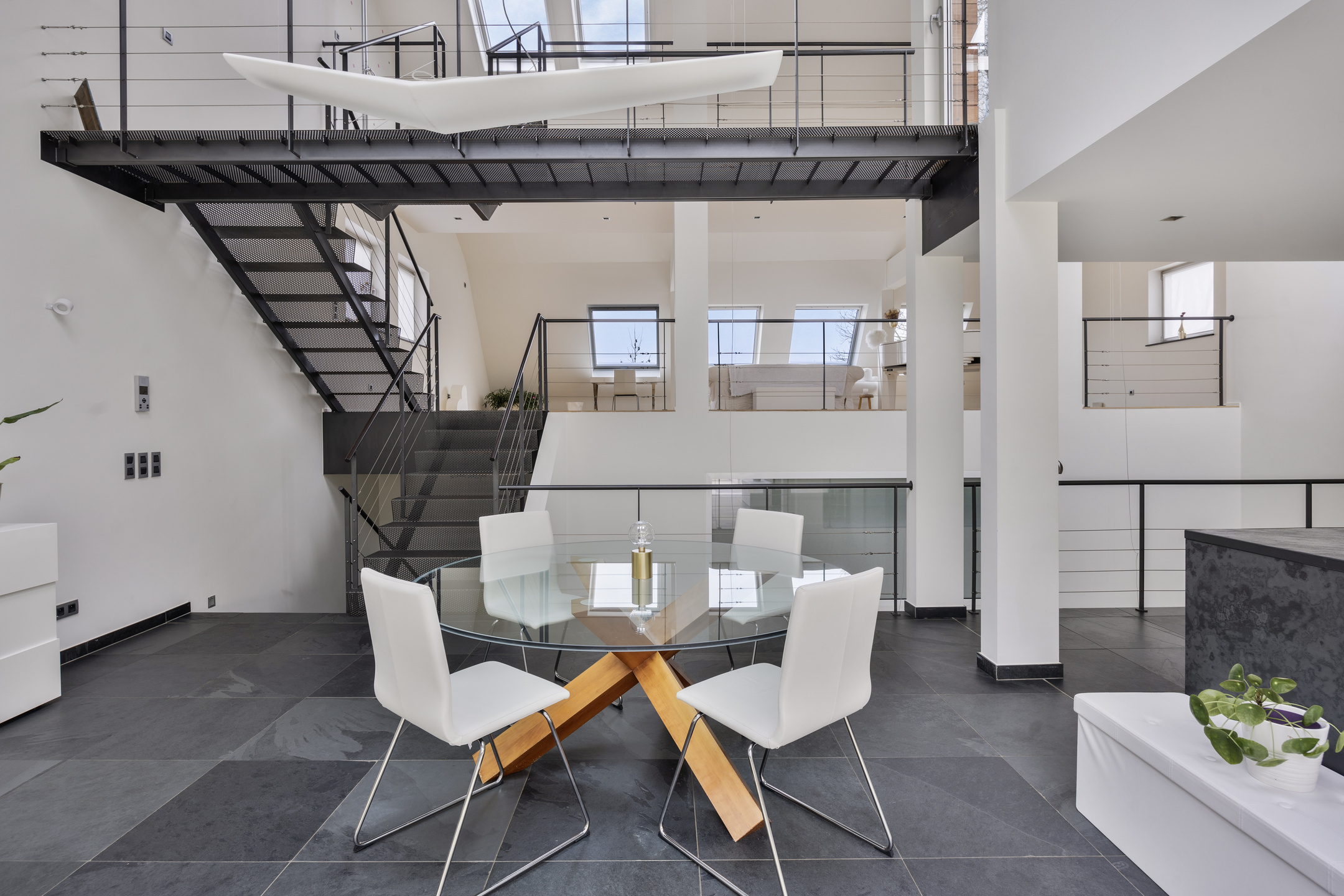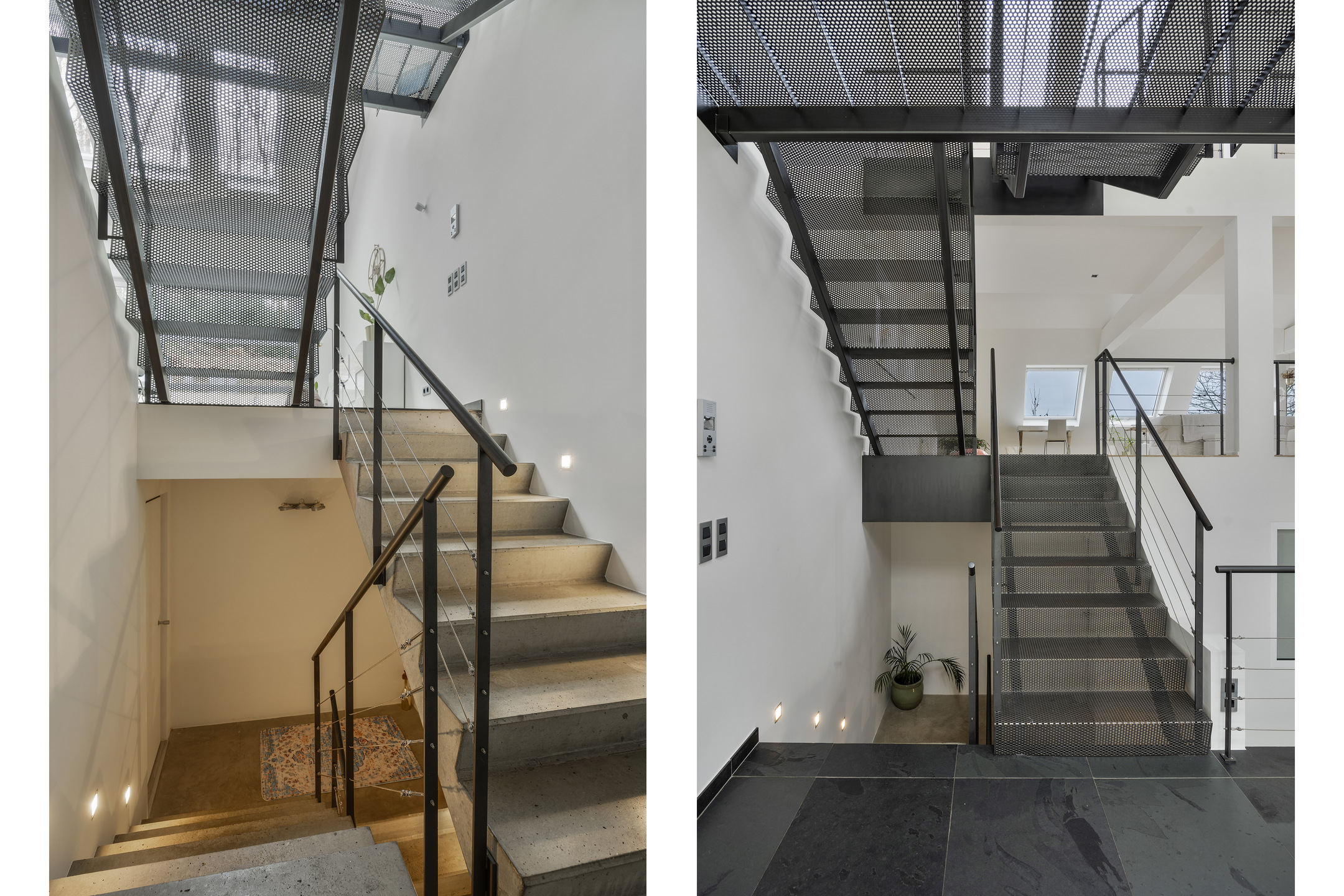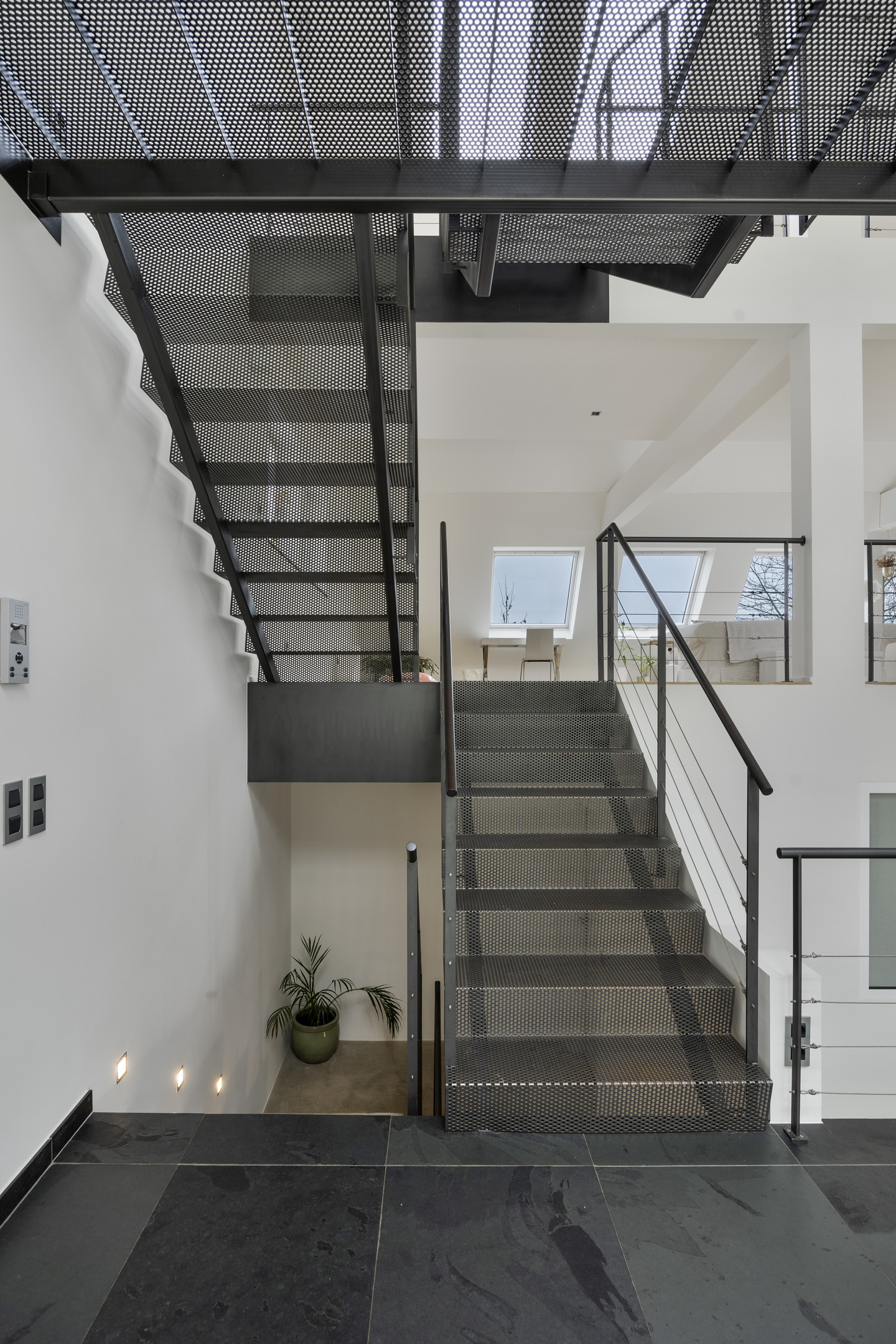 - Niveau +2,5: leefkeuken op tuinniveau. Groot keukeneiland met alle comfort. Overal leisteen (eiland en vloeren). Grote schuifdeuren naar het zuid-gerichte terras. Uitzicht op groen. Geen inkijk.