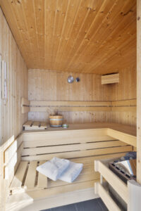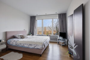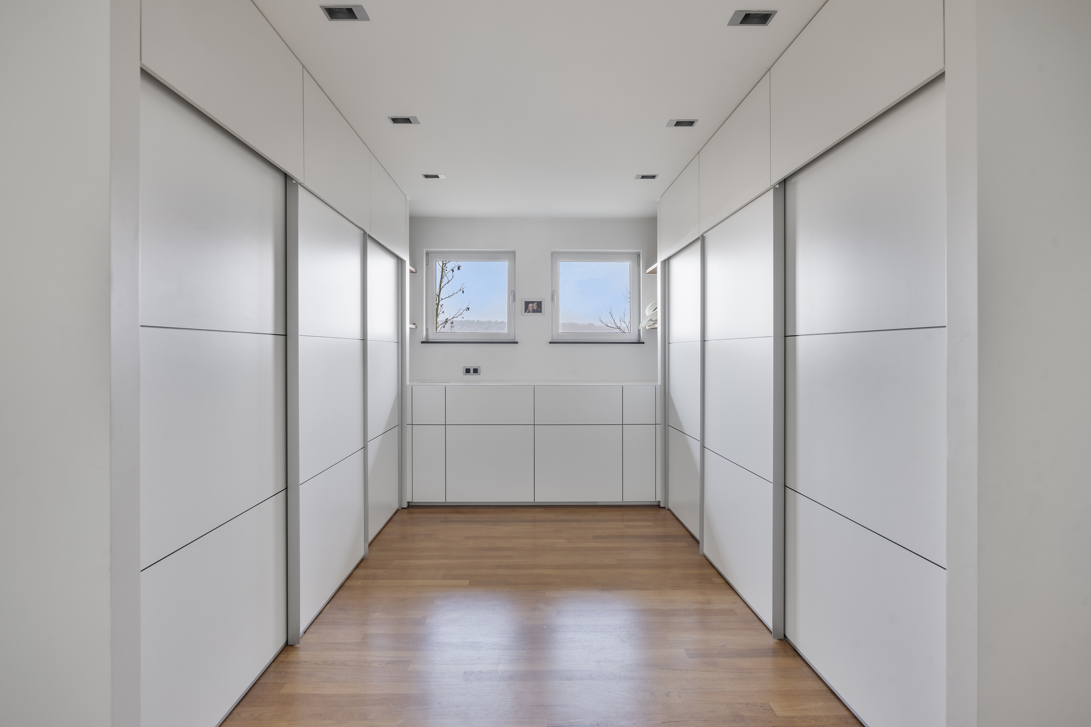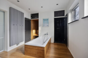 - Niveau +2: masterbedroomsuite bestaande uit mooie slaapkamer, zeer ruime aparte dressing (aansluiting wasmachine/droogkast ook hier mogelijk) met ingemaakte linnenbak, luxueuze badkamer met vrijstaand ligbad, inloopdouche, wastafel , apart toilet en Finse sauna. Alles in parket.