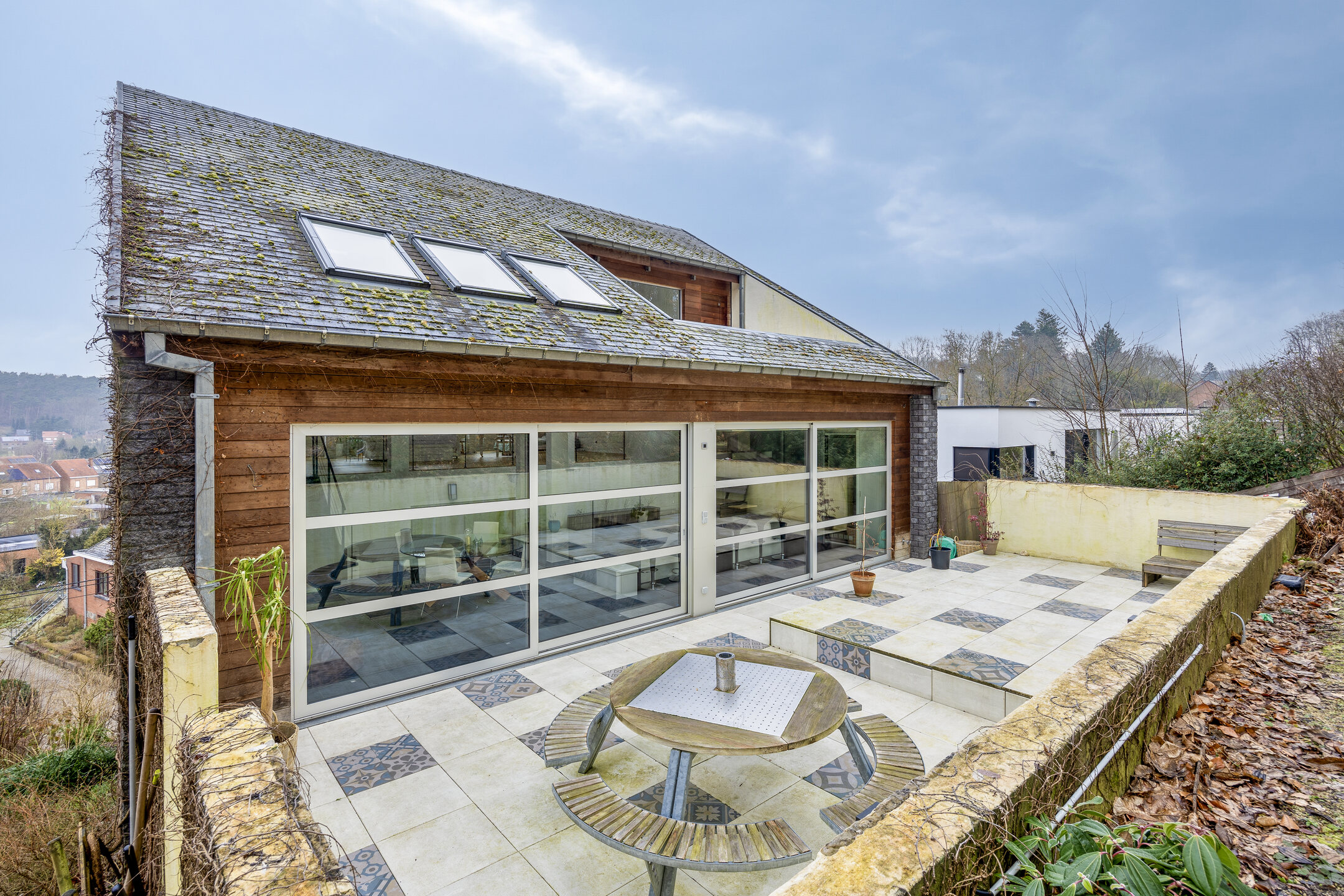 - Niveau + 3,5: open bureauruimte (in contact met leefkeuken en leefruimte) met vergezicht. Parket. Kan ook dienst doen als bibliotheek, Tv-hoekje,...+ prachtig zonneterras.